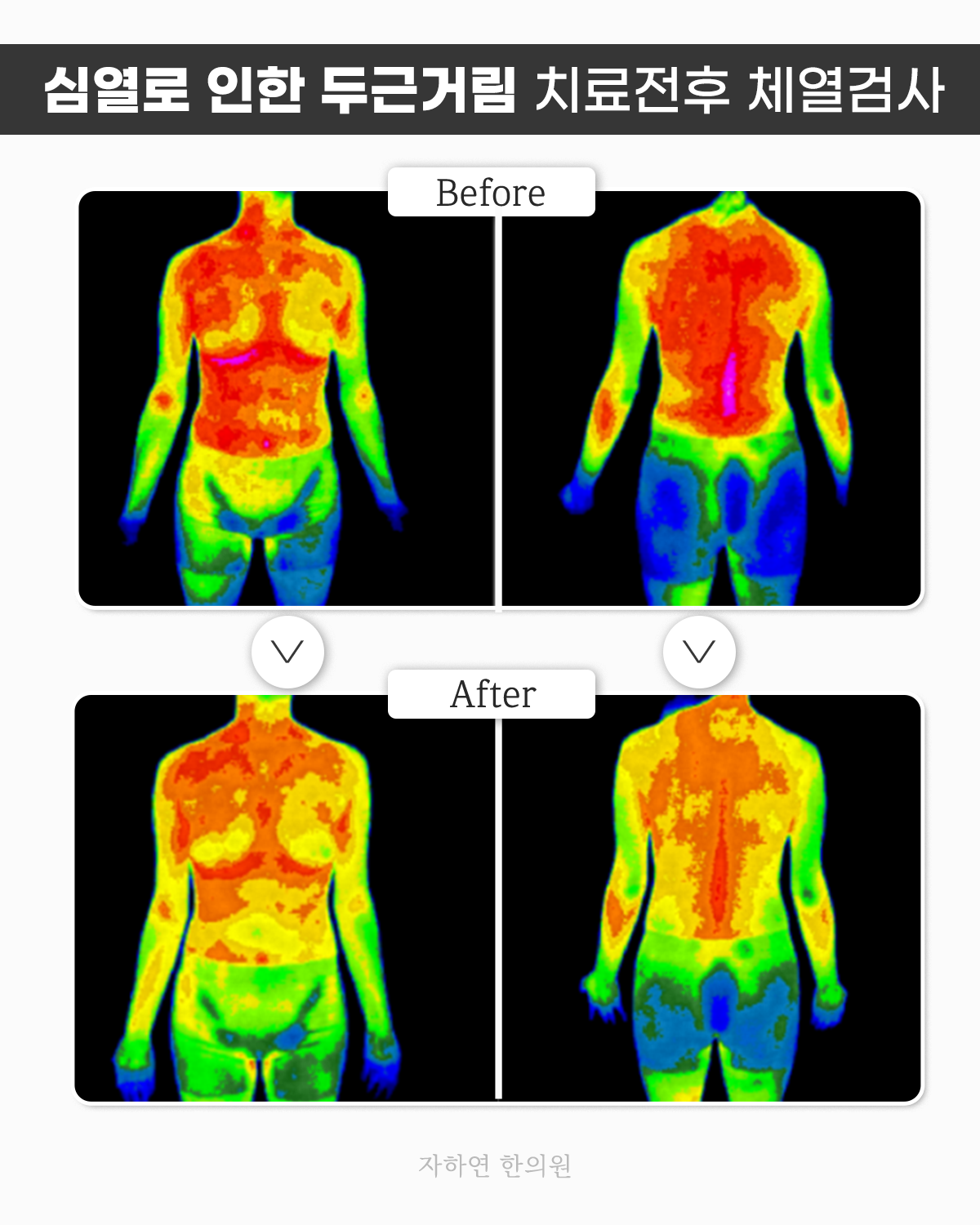 책임감이 강한 탓에 스스로 압박감을 오랜 시간 받고 있던 데다가 몸을 쉬어주지 않고 계속 일을 하다보니 쌓인 피로가 심장에 열로 이어진 것으로 보였습니다. 무리한 심장이 과열되고 심장열이 쌓이니 적외선 체열검사결과에서도 상체가 전체적으로 붉게 나타나고 있었습니다. 심장의 열이 뭉치고 위로 올라 상열되니 가슴이 두근거리고 열감으로 인해 답답함이 커진 것으로 보였습니다.